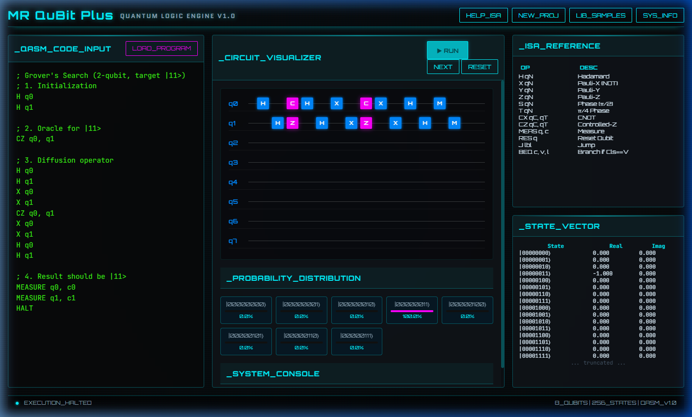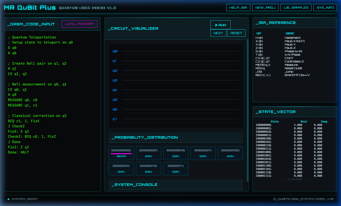 Welcome to MR QuBit Plus, a high-fidelity quantum assembly workbench. This tool allows for professional-grade educational exploration of quantum gate logic within a sleek, mainframe-inspired interface.